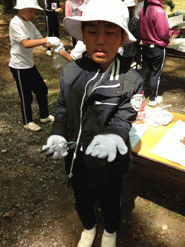 腐葉土の中には虫たちもたくさんいます。苦手そうな子ども(教師)もいましたが…