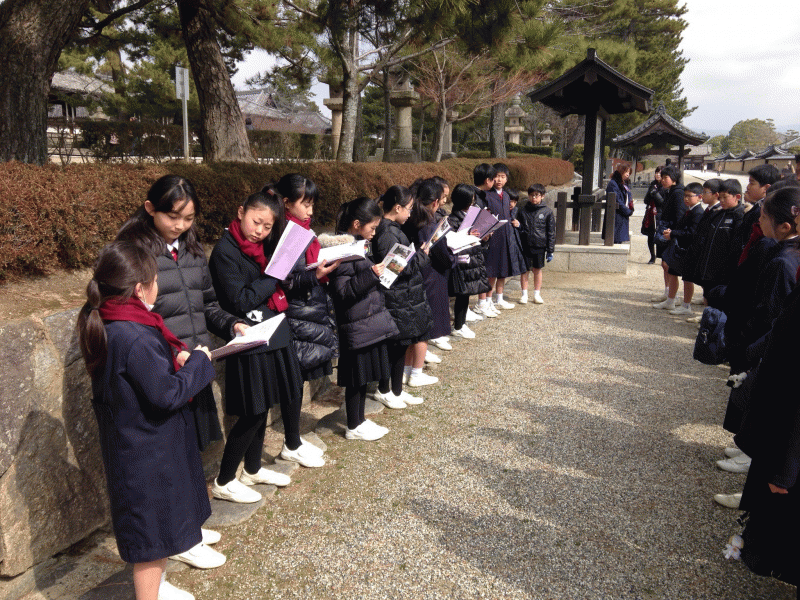 全 3004 件(全601ページ) 過去のページもご覧いただけます ⇒ 前へ 526 | 527 | 528 | 529 | 530 | 次へ 2014/2/21 56期 女子調理実習 シチュー 今日は城星学園で最後の調理実習の日。今年は、シチューに挑戦です。人参、ジャガイモ、鶏肉を切って煮込んでいきます。おいしくできるかなぁ・・・。 今日は城星学園で最後の調理実習の日。今年は、シチューに挑戦です。人参、ジャガイモ、鶏肉を切って煮込んでいきます。おいしくできるかなぁ・・・。 将来、台所に立つ姿が想像できそうですね・・・・。 将来、台所に立つ姿が想像できそうですね・・・・。 56期 女子調理実習 シチュー 2014/2/21 今日は城星学園で最後の調理実習の日。今年は、シチューに挑戦です。人参、ジャガイモ、鶏肉を切って煮込んでいきます。おいしくできるかなぁ・・・。 今日は城星学園で最後の調理実習の日。今年は、シチューに挑戦です。人参、ジャガイモ、鶏肉を切って煮込んでいきます。おいしくできるかなぁ・・・。 将来、台所に立つ姿が想像できそうですね・・・・。 将来、台所に立つ姿が想像できそうですね・・・・。 2014/2/21 14時30分 最後のポイント法隆寺を出発して学校に帰ります 歴史学習旅行で訪れる最後の場所,法隆寺。国宝の数も非常に多く,時間がいくらあっても足りません。 まずは5年生全員で記念撮影。 まずは5年生全員で記念撮影。 最後の発表はクイズもおりまぜられ,とても楽しいものでした。 最後の発表はクイズもおりまぜられ,とても楽しいものでした。 ガイドさんが詳しく,そしてわかりやすく教えてくださいます。 ガイドさんが詳しく,そしてわかりやすく教えてくださいます。 本物をたくさんみることができた旅行でした。この経験をこれからの学習にいかしましょう。 本物をたくさんみることができた旅行でした。この経験をこれからの学習にいかしましょう。 14時30分 最後のポイント法隆寺を出発して学校に帰ります 2014/2/21 歴史学習旅行で訪れる最後の場所,法隆寺。国宝の数も非常に多く,時間がいくらあっても足りません。 まずは5年生全員で記念撮影。 まずは5年生全員で記念撮影。 最後の発表はクイズもおりまぜられ,とても楽しいものでした。 最後の発表はクイズもおりまぜられ,とても楽しいものでした。 ガイドさんが詳しく,そしてわかりやすく教えてくださいます。 ガイドさんが詳しく,そしてわかりやすく教えてくださいます。 本物をたくさんみることができた旅行でした。この経験をこれからの学習にいかしましょう。 本物をたくさんみることができた旅行でした。この経験をこれからの学習にいかしましょう。 2014/2/21 11時30分 唐招提寺をあとにし,法隆寺に向かいます 唐招提寺では生活班でわかれて見学しました。 唐招提寺といえば校倉造り。湿気と害虫から守るために考えられました。 唐招提寺といえば校倉造り。湿気と害虫から守るために考えられました。 松尾芭蕉が訪れた時, 若葉して 御目の雫 拭はばやという俳句をつくりました。苦労してお寺を建てたのに失明して真偽を確かめられなかった鑑真を不憫に思い,太陽の光をたくさん浴びている若葉で尊い目から流れる涙をぬぐってあげたいという思いでつくられた俳句です。芭蕉句碑の前で 松尾芭蕉が訪れた時, 若葉して 御目の雫 拭はばやという俳句をつくりました。苦労してお寺を建てたのに失明して真偽を確かめられなかった鑑真を不憫に思い,太陽の光をたくさん浴びている若葉で尊い目から流れる涙をぬぐってあげたいという思いでつくられた俳句です。芭蕉句碑の前で 楽しんでますね〜約束したので1枚 楽しんでますね〜約束したので1枚 11時30分 唐招提寺をあとにし,法隆寺に向かいます 2014/2/21 唐招提寺では生活班でわかれて見学しました。 唐招提寺といえば校倉造り。湿気と害虫から守るために考えられました。 唐招提寺といえば校倉造り。湿気と害虫から守るために考えられました。 松尾芭蕉が訪れた時, 若葉して 御目の雫 拭はばやという俳句をつくりました。苦労してお寺を建てたのに失明して真偽を確かめられなかった鑑真を不憫に思い,太陽の光をたくさん浴びている若葉で尊い目から流れる涙をぬぐってあげたいという思いでつくられた俳句です。芭蕉句碑の前で 松尾芭蕉が訪れた時, 若葉して 御目の雫 拭はばやという俳句をつくりました。苦労してお寺を建てたのに失明して真偽を確かめられなかった鑑真を不憫に思い,太陽の光をたくさん浴びている若葉で尊い目から流れる涙をぬぐってあげたいという思いでつくられた俳句です。芭蕉句碑の前で 楽しんでますね〜約束したので1枚 楽しんでますね〜約束したので1枚 2014/2/21 9時30分 只今,大仏殿を見学中 スケールの大きさにみんな興味を持って見学しています。 9時30分 只今,大仏殿を見学中 2014/2/21 スケールの大きさにみんな興味を持って見学しています。 2014/2/21 8時50分 宿舎を出発して東大寺にむかっています 短い間でしたが宿舎の方には大変お世話になりまし