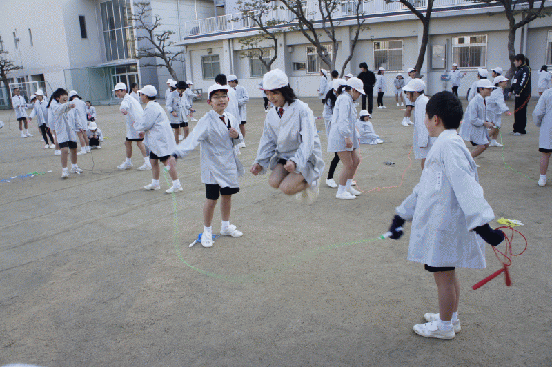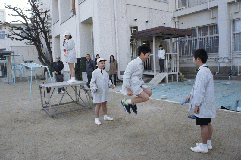 今日は3人組での「なわとび」です。まずは運動委員の児童がお手本を見せます。