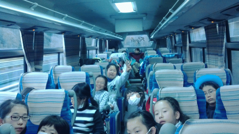 現在15時。バス2台は、長野県を走行中。子どもたちはみんな元気です。目的地まで約100キロまできました。