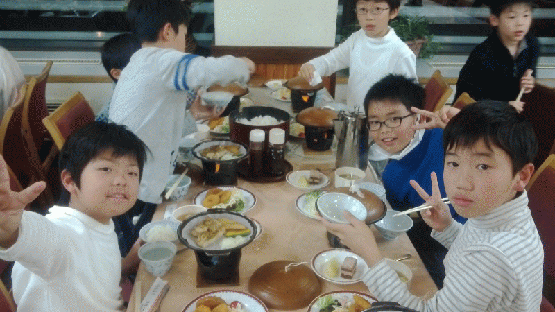 18時。楽しみにしていた夕ご飯の時間です。信州はやはり米所。お米がおいしい・・・・。このあと、スキーの靴合わせを行います。