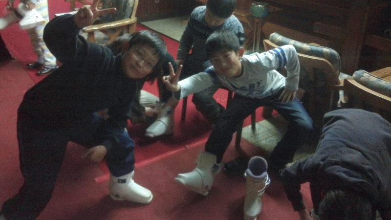19時。4日間つかうスキーの靴を合わせています。はじめてはくスキー靴をフラフラしながらはいています。このあとみんなでお風呂タイム。大きなお風呂が楽しみです。