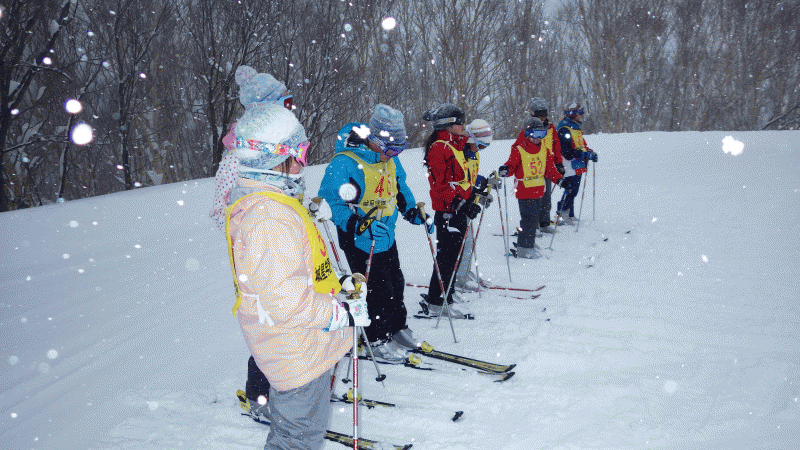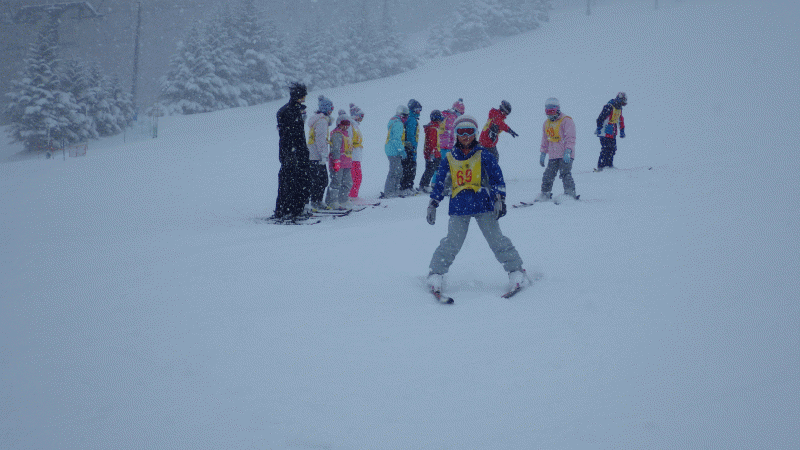 午前中のレッスンの様子です。参加者72名全員レッスンを受けました。スキーの板をはくのになれてからゲレンデへ向かいます。天気は雪。ずっと降り続いています。午後からは、各班リフトに乗って新しい場所でレッスンを受けます。