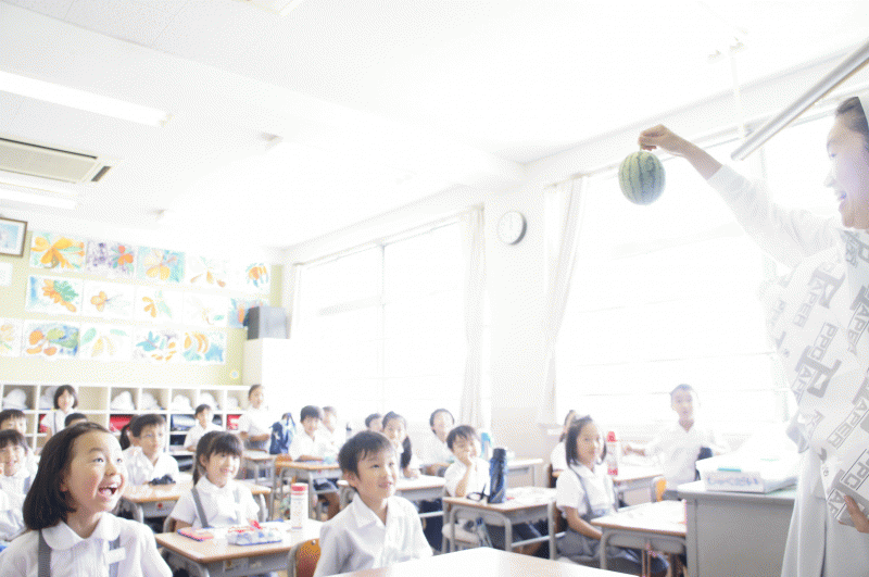 1年生の前にスイカが!「うわ〜!!」と歓声が上がります。