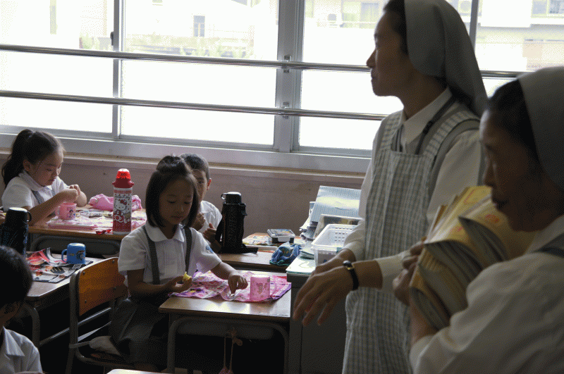 タイミング良く戸井田シスターも教室に入ってきました。残っていたスイカをパクリ!