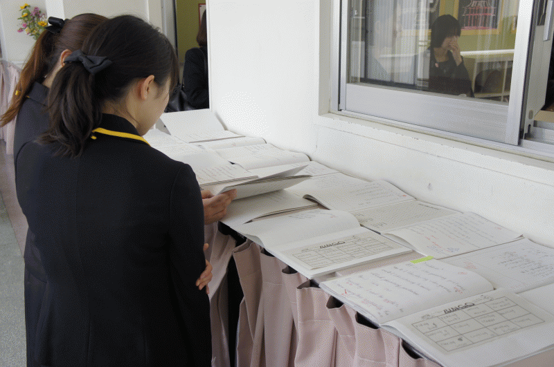 廊下や教室には、子どもたちの力作のノートが並びます。コツコツと学習を続けた結果がノートに表れています。