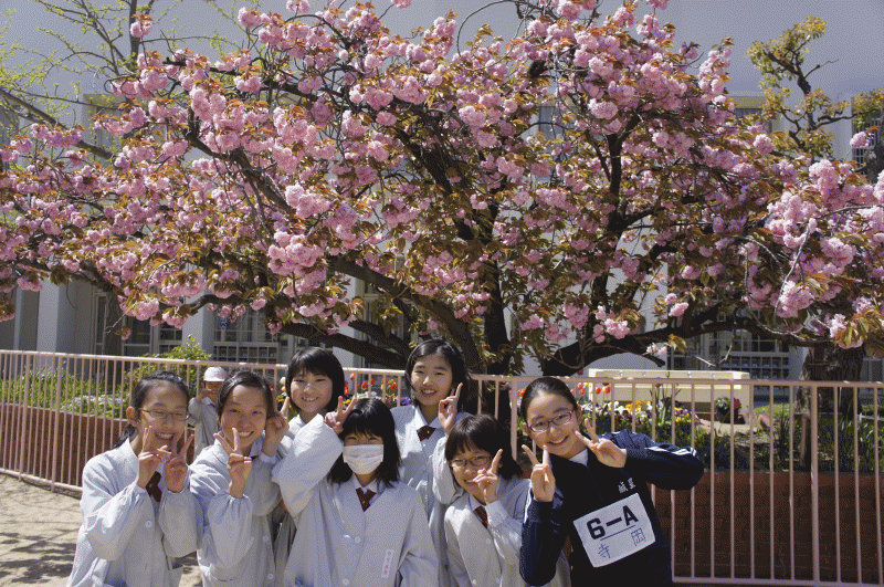 きれいな桜の下で、きれいどころの6年生が「はいチーズ」