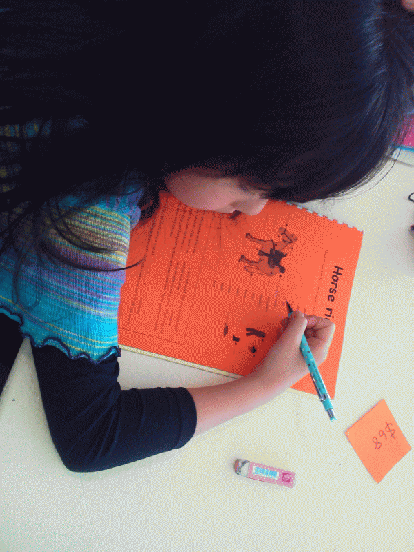 休み時間は、ティータイム。お茶とお菓子をいただいて外で遊びました。後半は午後からの乗馬体験で使う英語のお勉強。鐙は・・・英語で何というのかな?