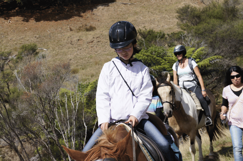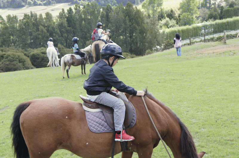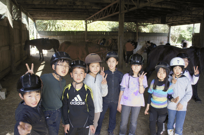 馬とのふれあい心ときめかせ、やってきました。自分の馬の名前を覚えてご挨拶。乗り方も教わったとおりにやってみました。坂道を下るのがちょっと怖かったけど無事にみんな上手に乗りこなしました。