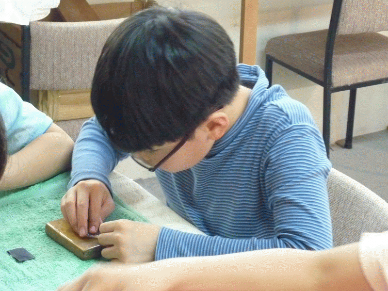 もう一つのチームは、ボーンカービングで牛の骨を削り飾りを作りました。細かい作業を集中して頑張りました。どんな作品ができたかな?