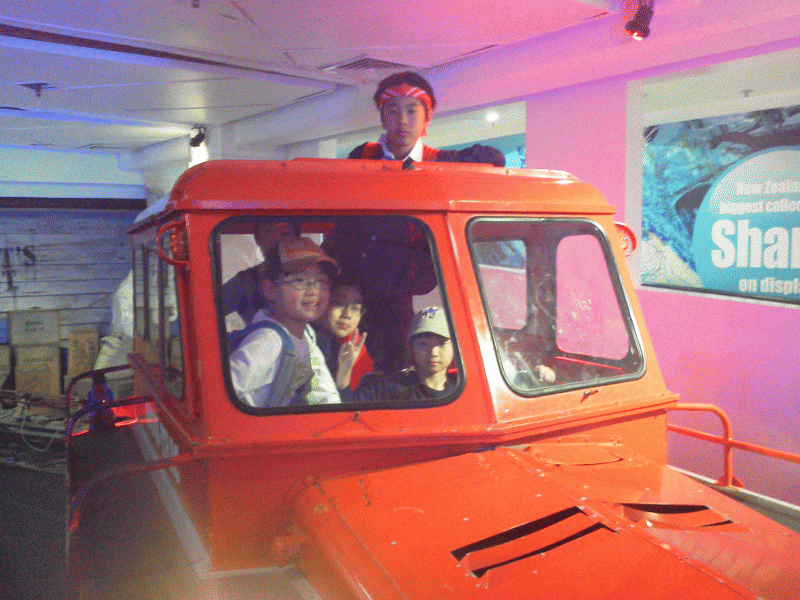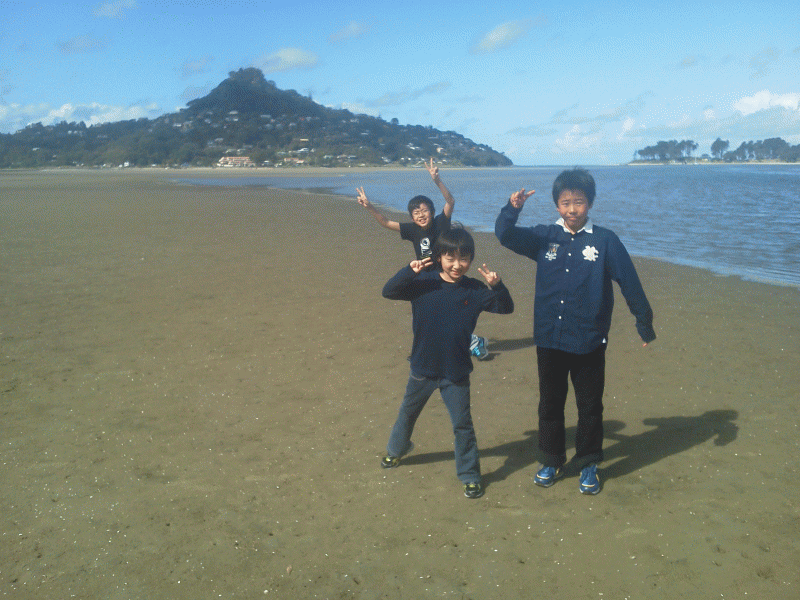 オークランドから3時間のバスの移動です。子どもたちは休憩時間にちょっと公園へ。海の見える公園でカニを穴から掘り返して捕まえてます。「カニ持って帰っていい?」と子どもたち・・・。「かわいそうやろう・・・」先生。諦めました。この後、1時間ほどでホームステイ目的地に到着です。