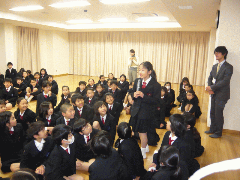 今日は音楽朝会、1年生と3年生が発表をしてくれました。