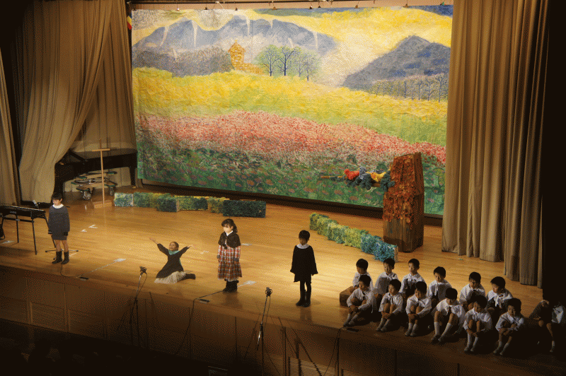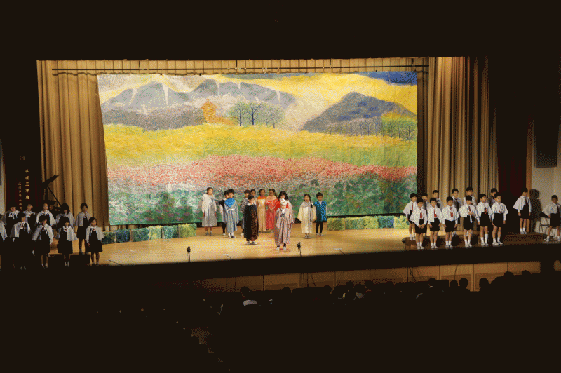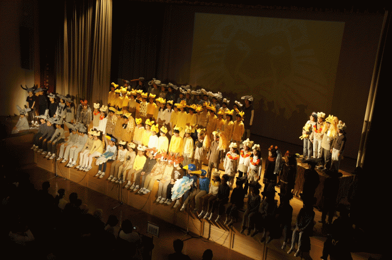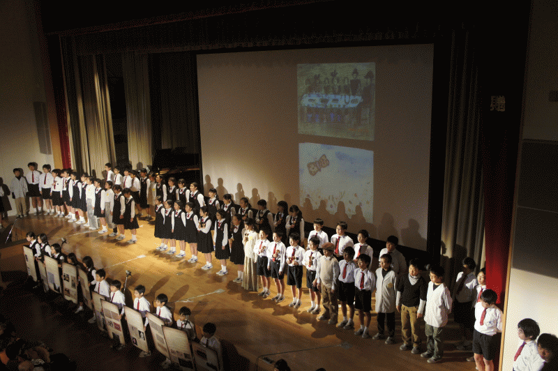 6年生の国語の教科書に掲載されている物語。今回は作者である野村路子さんの協力のもと、今回の作品が生まれました。子どもたちがこの作品から感じ学びとったものを、舞台作品として発表しました。照明や画像すべて子どもたちの手作りとなったこの作品。最後の歌と共に観る人の心にも強いメッセージとして届きました。