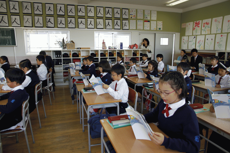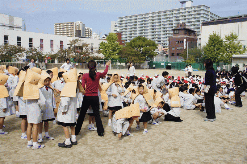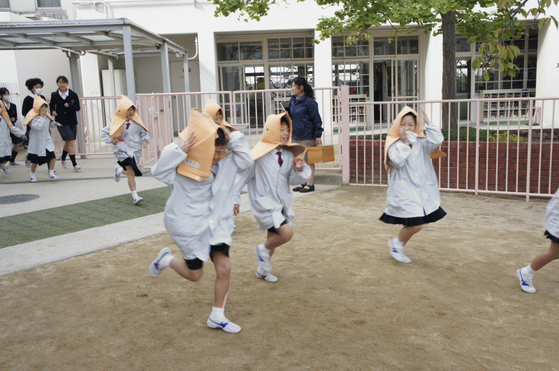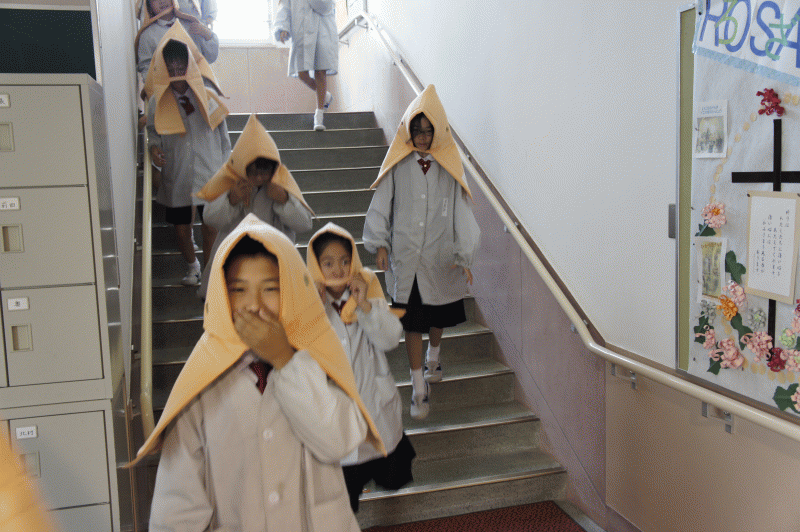 地震予測の放送が流れ、子どもたちは速やかに机の下に隠れます。