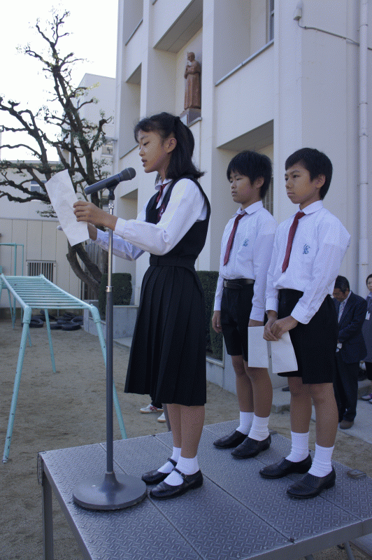 毎週月曜日は宗教朝会、校長先生や教頭先生がお話をしてくださいます。そして毎月「月の御言葉」の発表をします。今月の御言葉は「互いに親切にし、思いやりあつく、心から赦しあう者となりなさい」です。5年生がこの御言葉について発表しました。