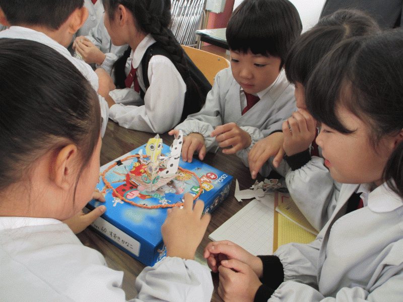 2年生の国語の学習「やってごらん、おもしろいよ」2年生は自分たちで1年生と何をするか企画し、説明し一緒に楽しみます。