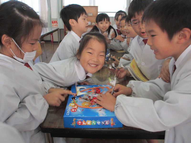 さあ、本番です。ちょっとお兄さんお姉さんになった2年生、かわいい1年生に遊び方を教えています。「はっけよ〜い!のこったのこった!」