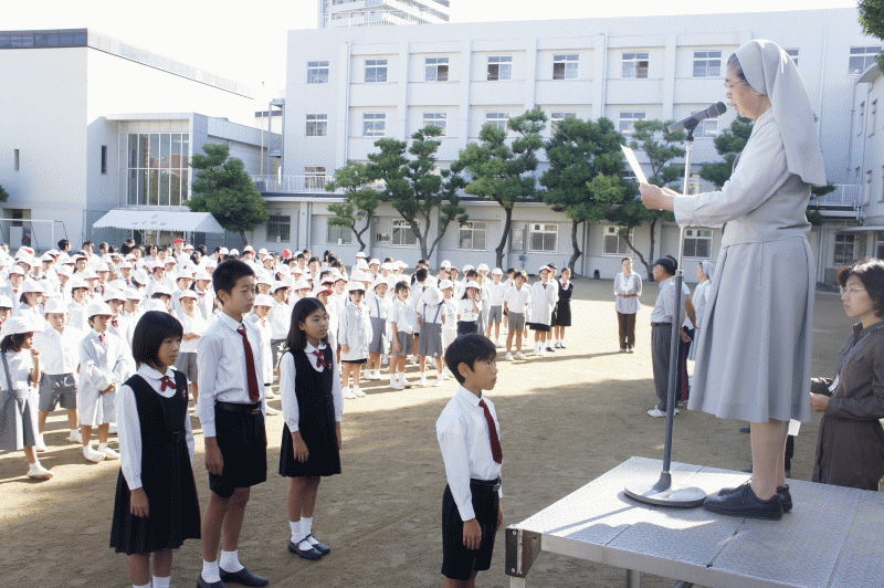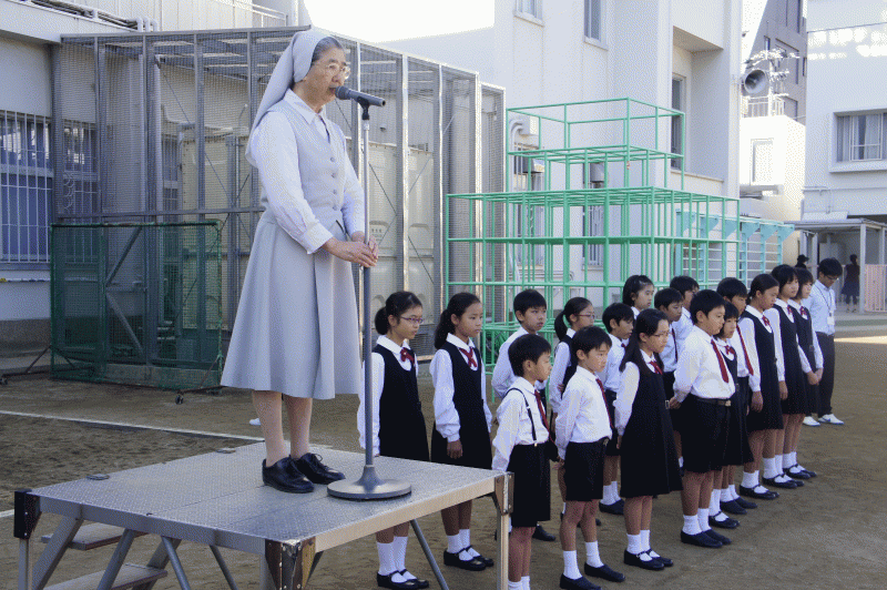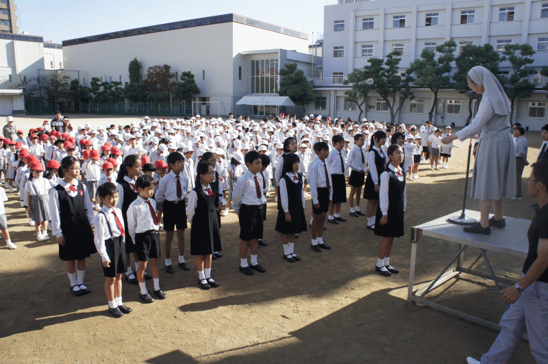 10月は読書月間、朝会の前に教室で読書をします。しかし今日は外での朝会。