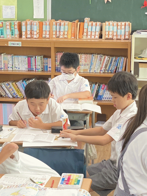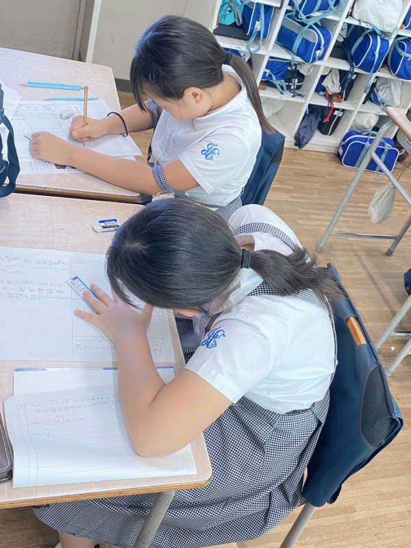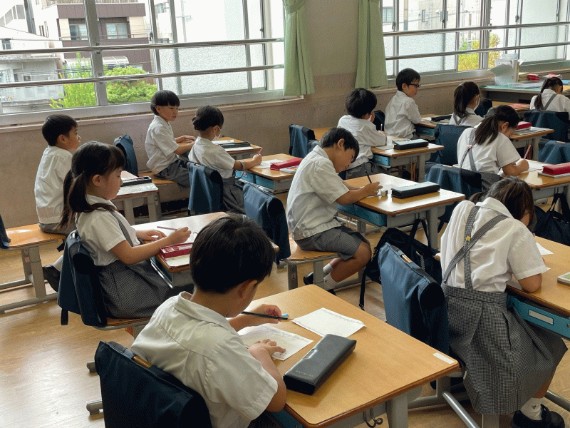 黒板をよく見て、丁寧に連絡帳を書いていました。
