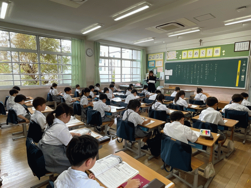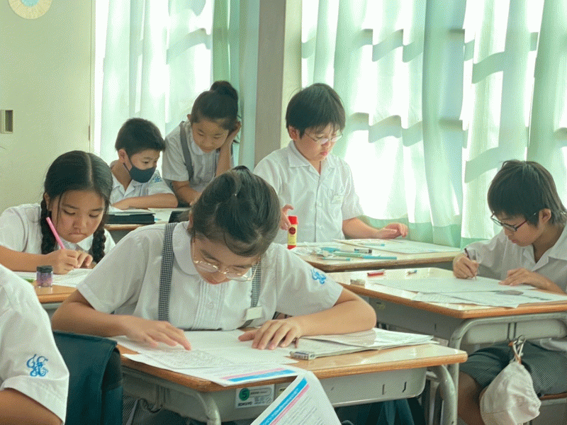 5・6年生はカリタスタイムで、口と足で描く協会のアーティスト 森田さんからお話をきき、絵を描かれる様子を直接見たときのことを報告しました。