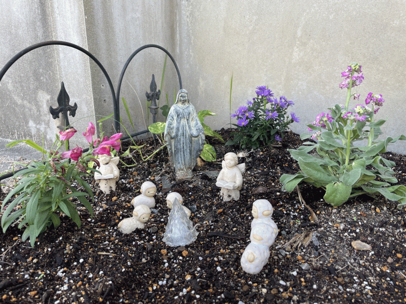 色とりどりのきれいなお花のそばで、マリアさまたちが子どもたちのことを見守ってくださいます。