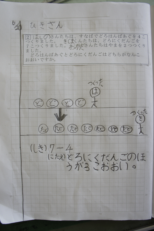 問題を読み、自分の頭にしっかりと理解させます。算数をただの数式に終わらせない工夫が見られます。