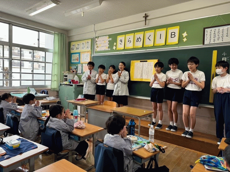 6年生が1年生の教室にきてお祈りの見本を見せました。