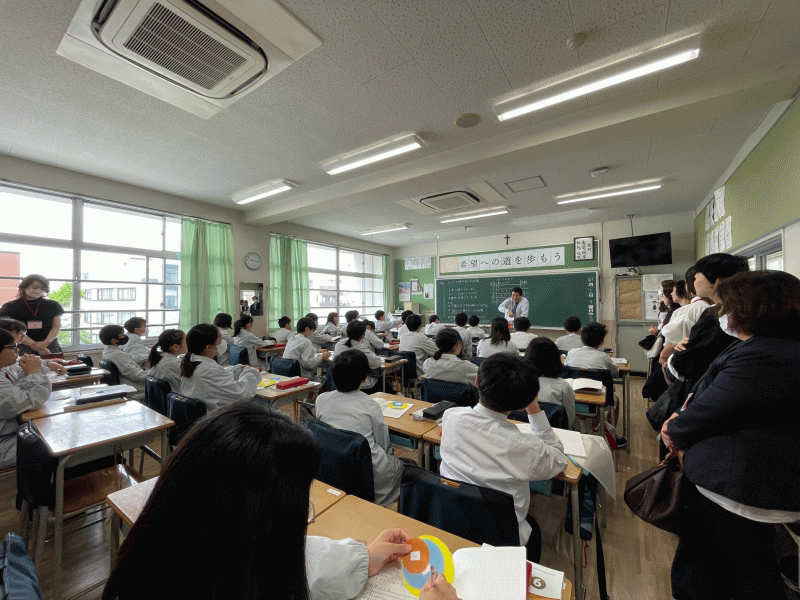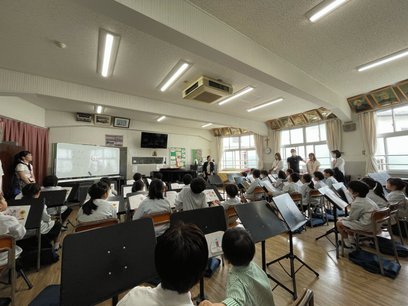 朝会のはじめに、全員で手をあわせてお祈りをし、聖歌を歌います。