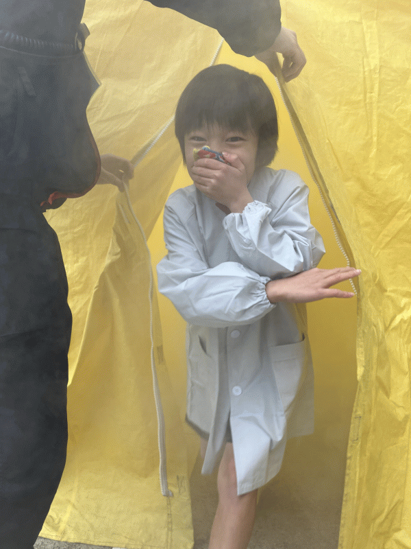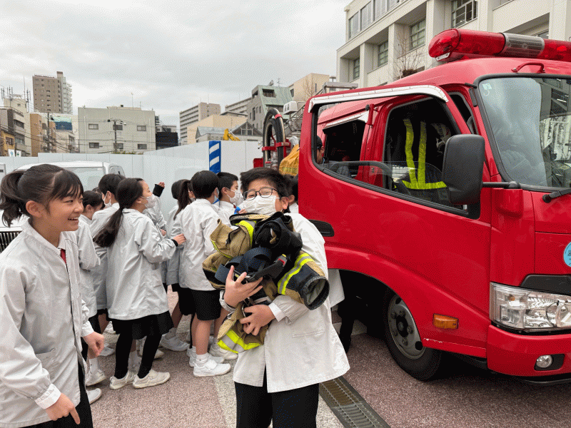 本物の消防車、消防士の方が身に付けていているものを触らせていただき、みんな「こんな重くて大きい服、靴なんだ!」とびっくり。