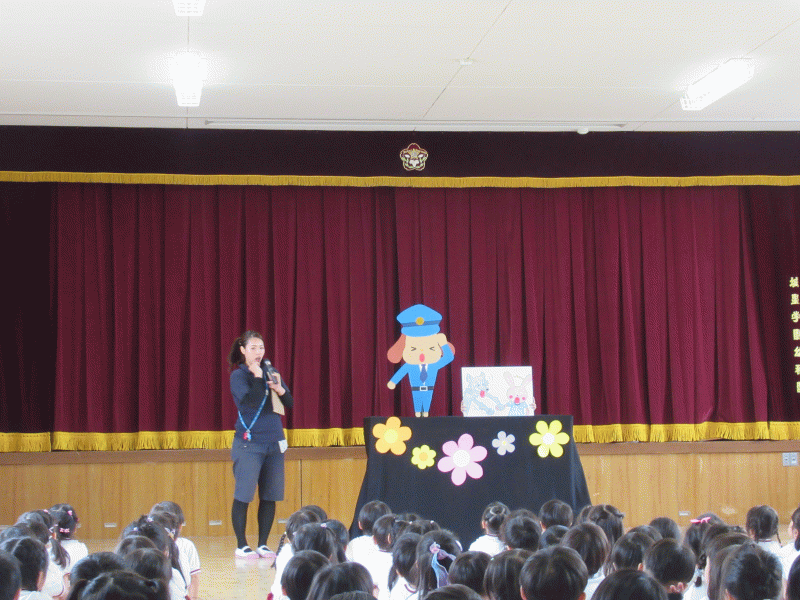 今日は、遊戯室に全園児が集まり、安全指導として「防犯」についてのお話をしました。