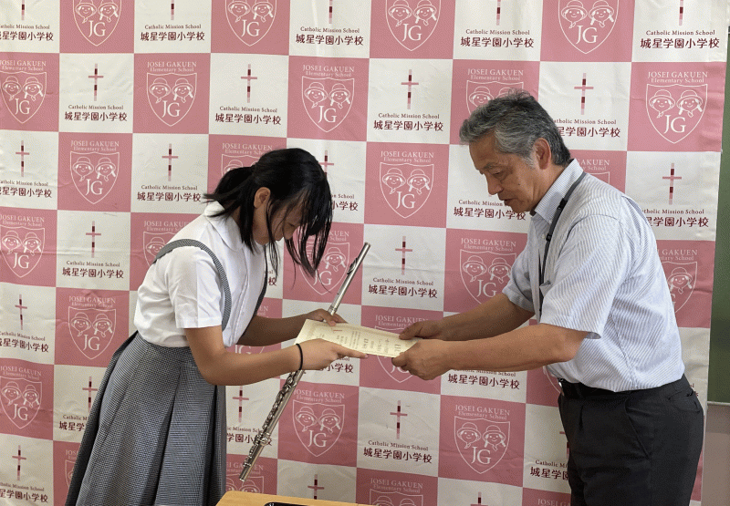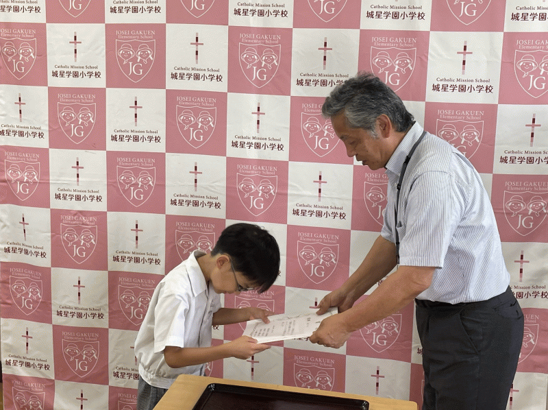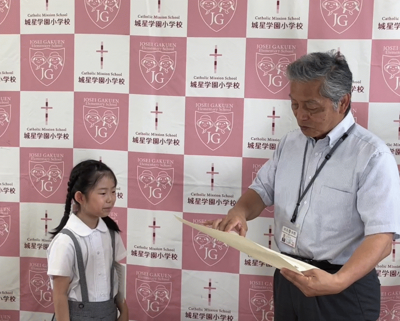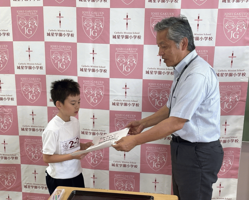 全 2986 件(全598ページ) 過去のページもご覧いただけます ⇒ 前へ 66 | 67 | 68 | 69 | 70 | 次へ 2024/6/18 心をあわせて 雨が上がり、午後から3・4年生が運動会集団演技の練習をしました。 普段は別々に過ごす3・4年生。 集団演技では、声を、動きを、心をあわせて、一生懸命に踊ります。 ひとりひとり輝いている姿がとても素敵です! 普段は別々に過ごす3・4年生。 集団演技では、声を、動きを、心をあわせて、一生懸命に踊ります。 ひとりひとり輝いている姿がとても素敵です! 心をあわせて 2024/6/18 雨が上がり、午後から3・4年生が運動会集団演技の練習をしました。 普段は別々に過ごす3・4年生。 集団演技では、声を、動きを、心をあわせて、一生懸命に踊ります。 ひとりひとり輝いている姿がとても素敵です! 普段は別々に過ごす3・4年生。 集団演技では、声を、動きを、心をあわせて、一生懸命に踊ります。 ひとりひとり輝いている姿がとても素敵です! 2024/6/17 光の子の「り」 休み時間、小聖堂ではお祈りの集いが開かれました。今日は、長いお箸を使ってご飯を食べる天国と地獄のお話です。 地獄では、自分一人だけでご飯を食べようとしますが、長いお箸ではご飯をつかむことができても口に運ぶことができないので、食べることができません。 天国では、一人が長いお箸でご飯をつかんで、もう一人の口に運びます。協力することで、みんながご飯を食べることができます。 地獄では、自分一人だけでご飯を食べようとしますが、長いお箸ではご飯をつかむことができても口に運ぶことができないので、食べることができません。 天国では、一人が長いお箸でご飯をつかんで、もう一人の口に運びます。協力することで、みんながご飯を食べることができます。 光の子の「り」は、隣人の必要に気付く子。 自分のことだけでなく、周りの人のことを考えて、大切に過ごすことができますように。 光の子の「り」は、隣人の必要に気付く子。 自分のことだけでなく、周りの人のことを考えて、大切に過ごすことができますように。 光の子の「り」 2024/6/17 休み時間、小聖堂ではお祈りの集いが開かれました。今日は、長いお箸を使ってご飯を食べる天国と地獄のお話です。 地獄では、自分一人だけでご飯を食べようとしますが、長いお箸ではご飯をつかむことができても口に運ぶことができないので、食べることができません。 天国では、一人が長いお箸でご飯をつかんで、もう一人の口に運びます。協力することで、みんながご飯を食べることができます。 地獄では、自分一人だけでご飯を食べようとしますが、長いお箸ではご飯をつかむことができても口に運ぶことができないので、食べることができません。 天国では、一人が長いお箸でご飯をつかんで、もう一人の口に運びます。協力することで、みんながご飯を食べることができます。 光の子の「り」は、隣人の必要に気付く子。 自分のことだけでなく、周りの人のことを考えて、大切に過ごすことができますように。 光の子の「り」は、隣人の必要に気付く子。 自分のことだけでなく、周りの人のことを考えて、大切に過ごすことができますように。 2024/6/14 カメさんの名前 飼育・栽培委員会によるテレビ放送がありました。 カメさんの名前をみんなで投票して決めます! 「みどり」「カメッチ」「のこのこ」「カメ子」「丸亀」 いったい、どの名前になるのでしょうか? カメさんの名前をみんなで投票して決めます! 「みどり」「カメッチ」「のこのこ」「カメ子」「丸亀」 いったい、どの名前になるのでしょうか? カメさんの名前 2024/6/14 飼育・栽培委員会によるテレビ放送がありました。 カメさんの名前をみんなで投票して決めます! 「みどり」「カメッチ」「のこのこ」「カメ子」「丸亀」 いったい、どの名前になるのでしょうか? カメさんの名前をみんなで投票して決めます! 「みどり」「カメッチ」「のこのこ」「カメ子」「丸亀」 いったい、どの名前になるのでしょうか? 2024/6/13 ぐんぐん成長中 2年生が育てている野菜たちです。 立派なナスが育ってきました。 立派なナスが育ってきました。 こちらはキュウリ。 黄色い花が咲いています。 他にもピーマンを育て中! こちらはキュウリ。 黄色い花が咲いています。 他にもピーマンを育て中! 昨年の1年生が見事に育てあげ、種を落としたアサガオが、芽を出しました! 昨年の1年生が見事に育てあげ、種を落としたアサガオが、芽を出しました! ぐんぐん成長中 2024/6/13 2年生が育てている野菜たちです。 立派なナスが育ってきました。 立派なナスが育ってきました。 こちらはキュウリ。 黄色い花が咲いています。 他にもピーマンを育て中! こちらはキュウリ。 黄色い花が咲いています。 他にもピーマンを育て中! 昨年の1年生が見事に育てあげ、種を落としたアサガオが、芽を出しました! 昨年の1年生が見事に育てあげ、種を落としたアサガオが、芽を出しました! 2024/6/12 輝くタラント 今日はたくさ