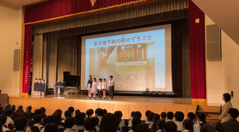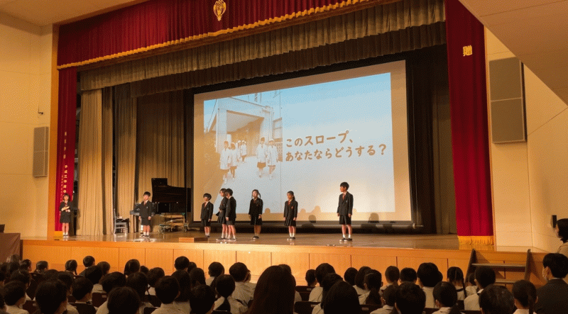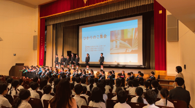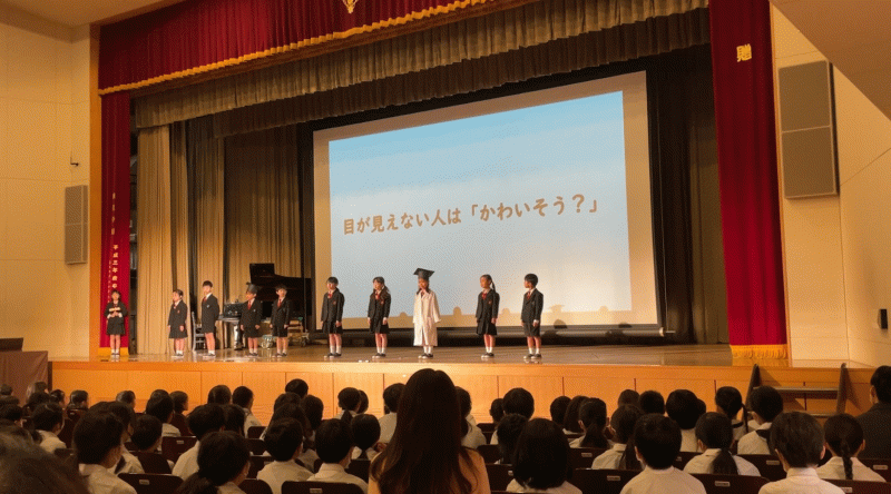 光の子集会があり、1・2年生は視覚障がいについて学んだことを分かち合いました。