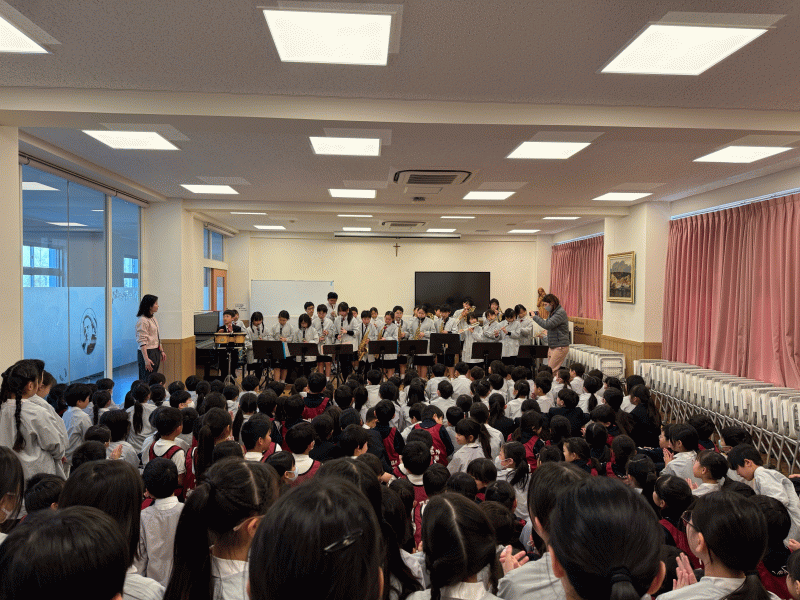 アンサンブルの児童が、低学年に向けてミニコンサートを行いました。