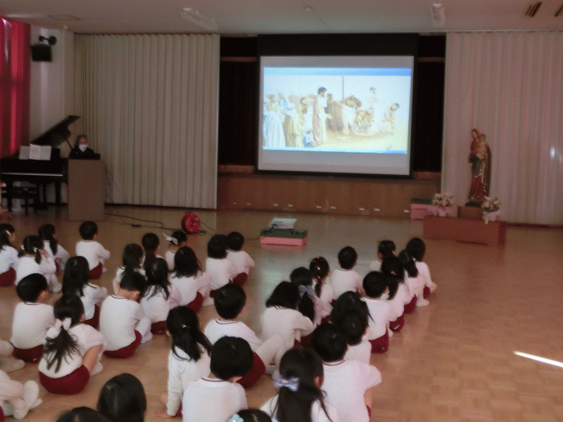 次に、野上シスターから「困っている人に優しくすると、心の中に温かい光がともる」という、くつやのマルチンのお話を聞きました。