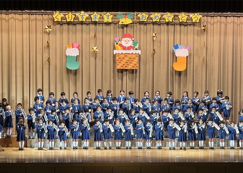 幼稚園では、年少、年中組のお子さんが『うたと合奏』を披露し、年長組のお子さんは、『イエス様の誕生の聖劇』を披露してくれました。そして、毎年恒例のサンタさんが登場!子どもたちも大喜びで、みんなで楽しいクリスマスを過ごすことができました。